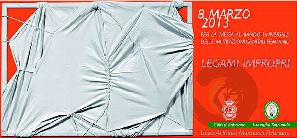 L’8 marzo, Giornata internazionale della Donna, vede la presentazione di LEGAMI IMPROPRI: progetto di comunicazione -condiviso da Consiglio Regionale/Assemblea legislativa delle Marche e Città di Fabriano- che, richiamando la Risoluzione dell’Assemblea Generale delle Nazioni Unite sulla messa al bando universale delle mutilazioni genitali femminili, sollecita l’attenzione sul femoneno della infibulazione. Il tema è evocato dall’opera MUTILAZIONE BIANCA con discrezione ed eleganza formale per il tramite di pieghe e cuciture che emergono dalla dimensione monocromatica della tela, che si affermano con forza espressiva nello spazio in virtù del gioco sapiente della luce e delle ombre, della valorizzazione grafica dell’opera: simbolo e rappresentazione concreta di una realtà tristemente presente ormai anche fuori dai confini del contesto culturale di origine.